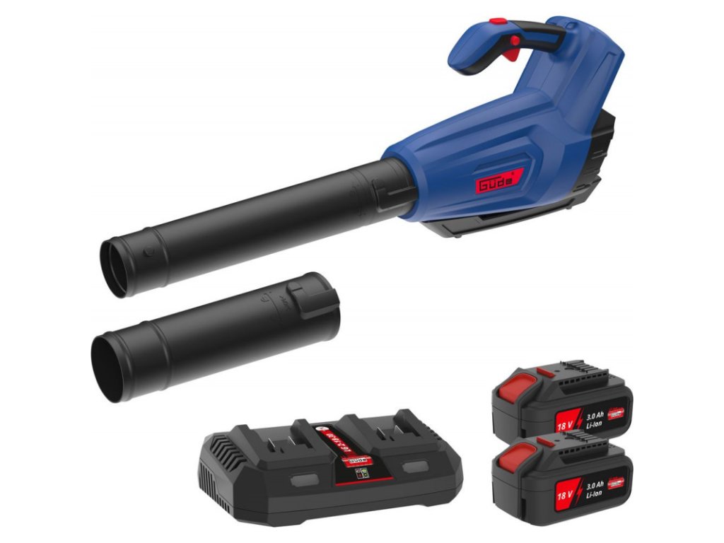 Akumulátorový fúkač lístia zo série akumulátorového náradia 18V E3 s turbo tlačidlom pre krátkodobý vyšší výkon. Ergonomicky tvarovaná rukoväť s mäkkým držadlom, odoberateľná fúkacia dýza, popruh na prenášanie. Vrátane 2 ks akumulátorov 18 V / 3,0 Ah a dvojitej nabíjačky. Na prevádzku sú potrebné dva akumulátory s kapacitou 18 V.