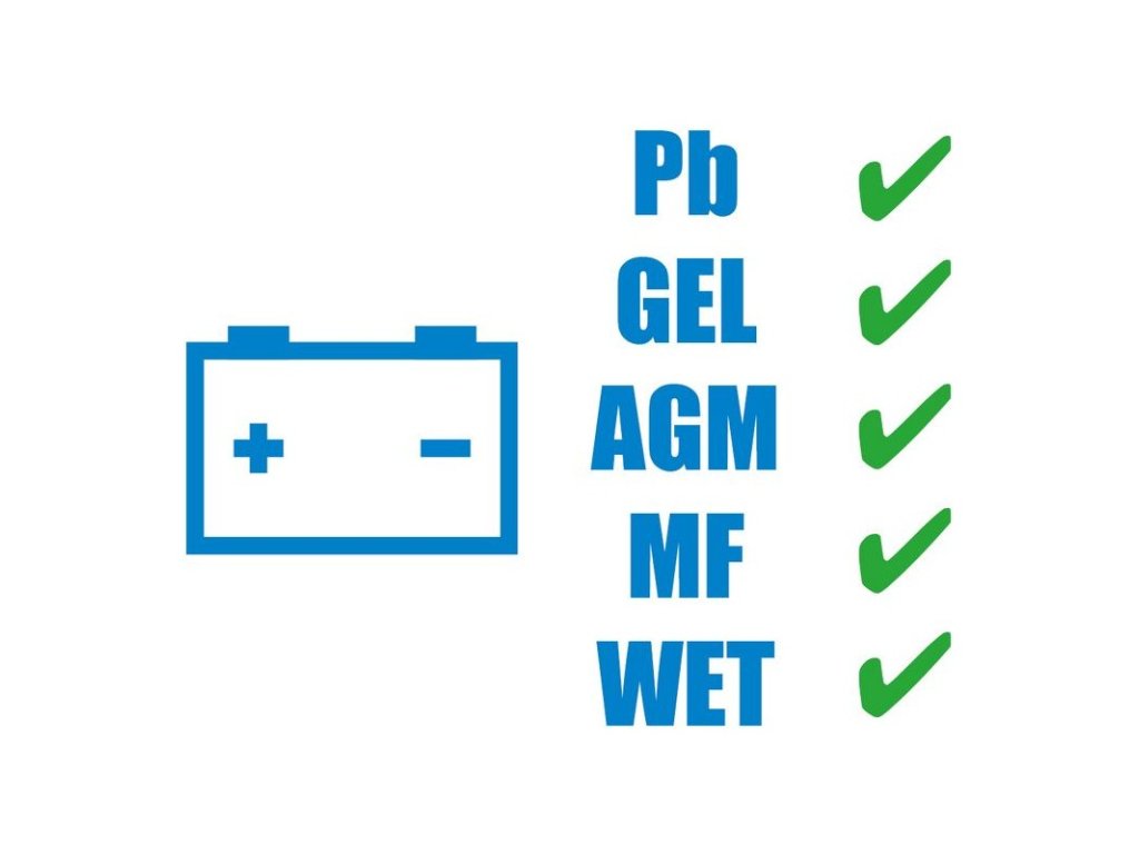 Invertorová technológia pre efektívne využitie energie. Procesorom riadená technológia inteligentného nabíjania, šesťstupňový proces nabíjania šetriaci batériu. Pre všetky bežné 12 V batérie. Možnosť priameho nabíjania batérie pripojenej vo vozidle. Konštantné udržiavacie nabíjanie, ochrana proti prepólovaniu a skratu, záchranná funkcia, najmä pre hlboko vybité batérie, plne izolované svorky batérie. Vhodné pre batérie PB - olovená batéria (aj MF), GEL - gélová batéria, AGM - prietoková batéria, WET - mokrá batéria.