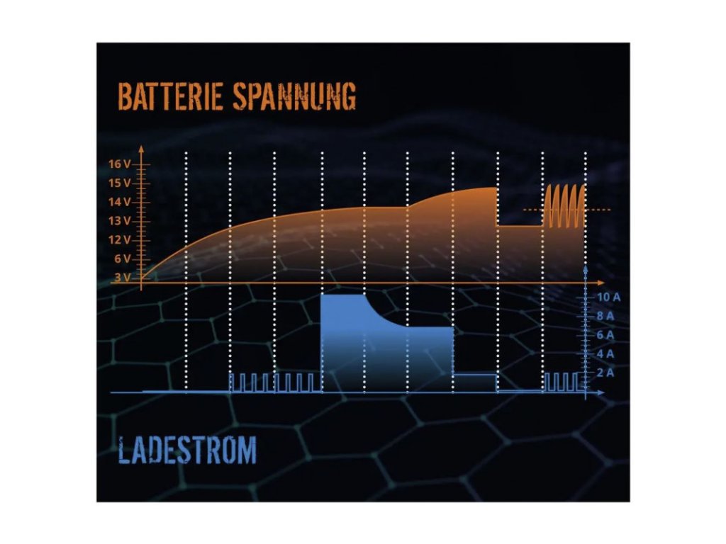 Automatická invertorová nabíjačka batérií 12V/6V-4A je vhodná pre všetky bežné typy autobatérií 6 V a 12 V. Obsluha je jednoduchá a citlivá elektronika vozidla je dobre chránená invertorovou technológiou. Vďaka plne izolovaným svorkám batérie je pripojenie nabíjačky jednoduché a bezpečné. Praktický LCD displej Vám na prvý pohľad zobrazí všetky dôležité informácie. Batéria je chránená funkciou udržiavacieho nabíjania, čo znamená, že stav nabitia je trvalo optimalizovaný. Má tiež ochranu proti prebitiu, skratu a prepólovaniu. Prístroj je vybavený rôznymi režimami, a tak pomocou špeciálneho obnovovacieho režimu dokáže pripraviť hlboko vybité batérie na opätovné použitie. Invertorová technológia pre efektívne využitie energie. Procesorom riadená technológia inteligentného nabíjania. 10-stupňové plnoautomatické nabíjanie šetriace batériu. Permanentné udržiavacie nabíjanie, možné priame nabíjanie batérie pripojenej vo vozidle. Ochrana proti prepólovaniu a skratu. Špeciálny obnovovací režim, obzvlášť pre hĺbkovo vybité batérie. Plne izolované svorky batérie, s praktickým uškom na zavesenie.