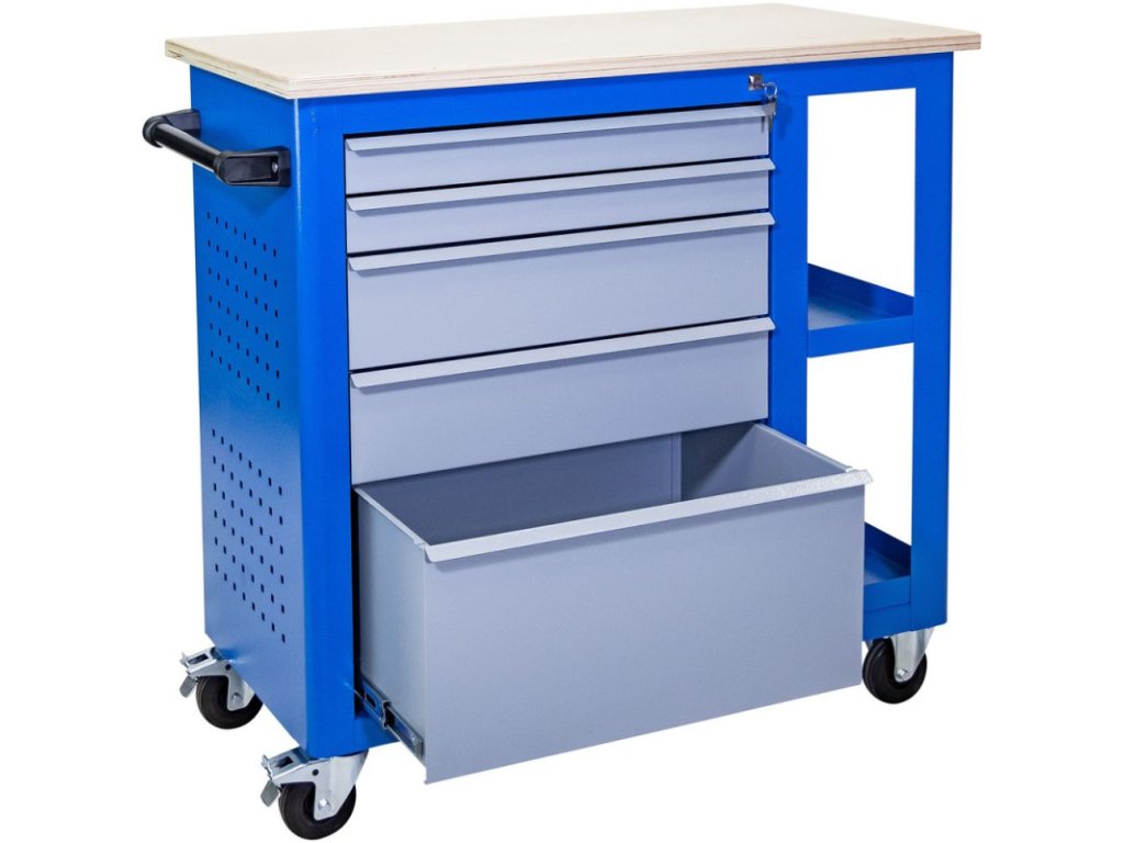 Päť zásuviek s plným vysúvaním na guľôčkových ložiskách ponúka nielen dostatok priestoru, ale aj dodatočné zabezpečenie vďaka centrálnemu uzamykaniu cylindrickým zámkom. Dielenský a pracovný vozík GWB 05 stojí na dvoch otočných kolieskach s brzdami a dvoch pevných kolieskach (každé s priemerom 100 mm) a vďaka praktickej rukoväti sa s ním ľahko manévruje.