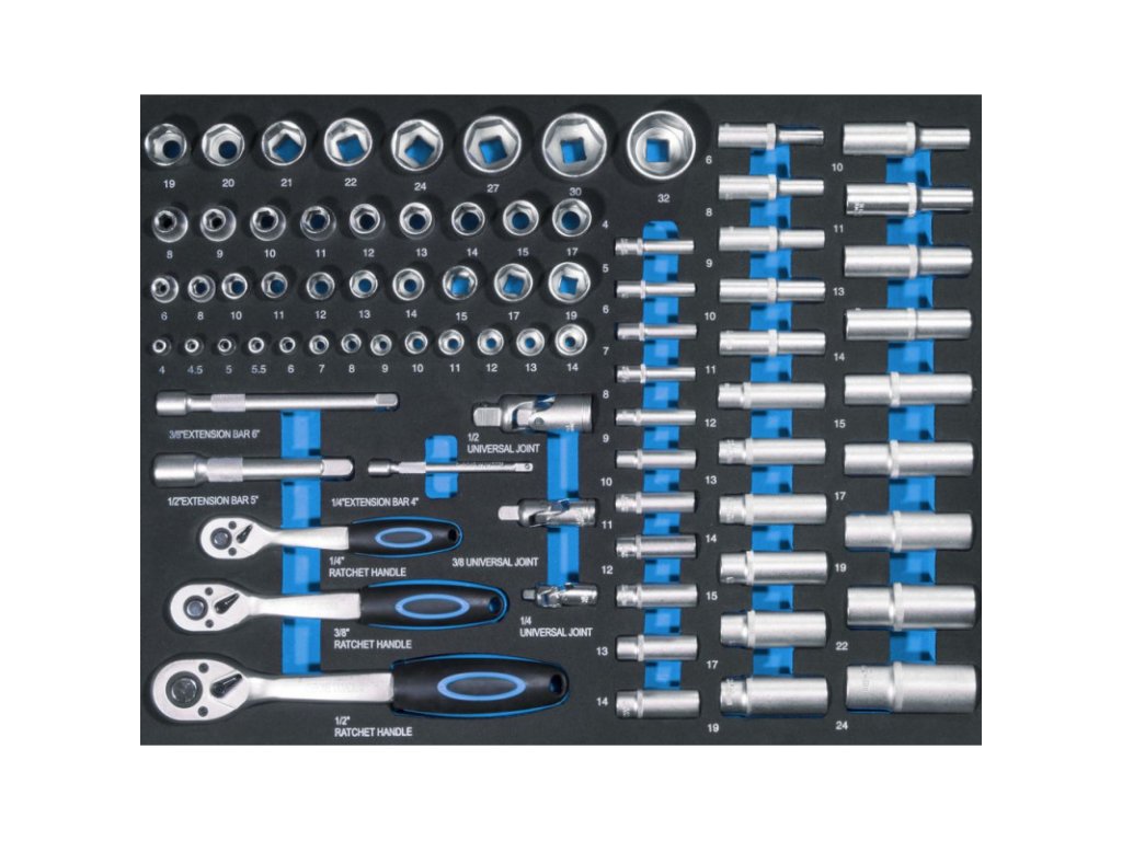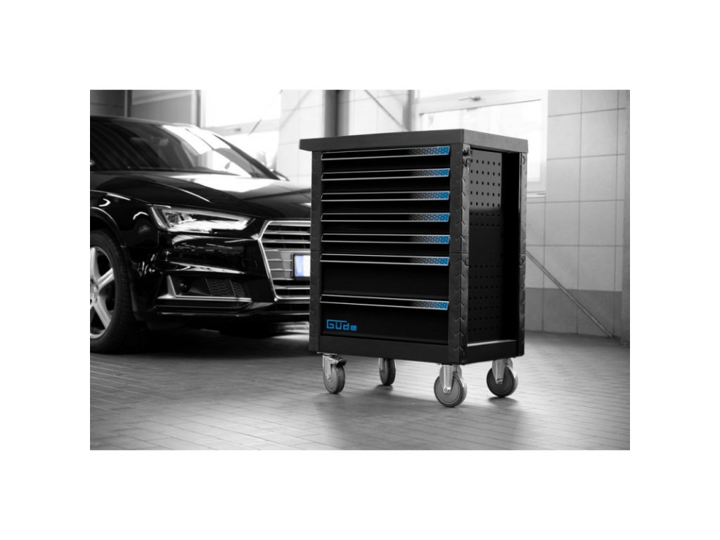 Pojazdný vozík s náradím do autodielne alebo garáže domáceho majstra. Pracovná plocha s integrovanými odkladacími priehradkami. Dvojstupňový systém uzamykania (centrálne uzamykanie s dvomi kľúčmi a samostatným uzamykaním zásuviek). Popisovateľné zásuvky s plným vysúvaním, uložené na guľôčkových ložiskách, s poistkou proti vytiahnutiu zásuviek. Normované dierovanie bočných stien umožňuje dodatočné možnosti rozšírenia na umiestnenie príslušenstva, ako napríklad dodatočných držiakov náradia, ochrana hrán, oceľový plech natretý práškovou farbou, pogumovaná rukoväť. Štyri veľké kolesá s ľahkým chodom (dve ovládateľné s brzdou).