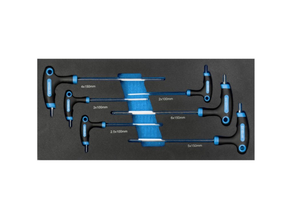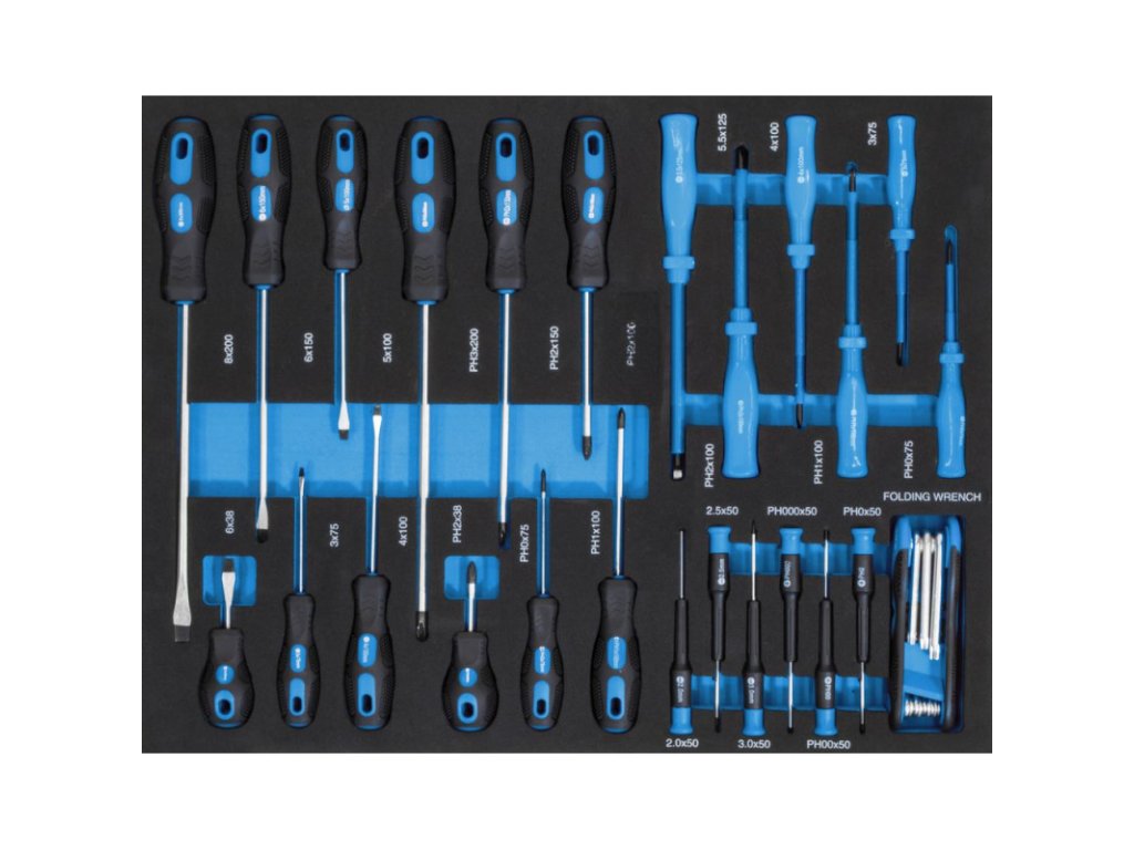 21 magnetických skrutkovačov s mäkkou rukoväťou: PHO/PH2x100, PH2x38, PH1x75, PH3x150, SL3/SL6x100, SL638, SL5x75, SL8x150, T6/T7/T8/T9/T10x75, T15/T20/T25/T27/T30x100, T40x150