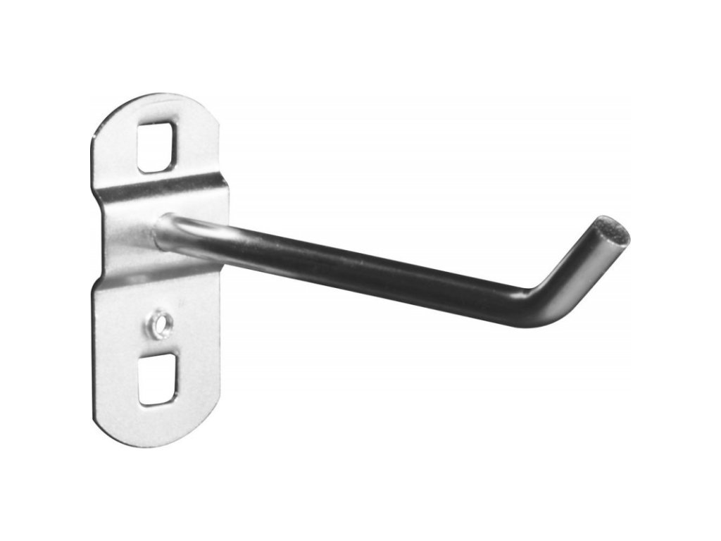 Držiak dielenského náradia a nástrojov na uchytenie do perforovanej steny a systémov so štvorcovými otvormi 8x8 - 10x10 mm, stredovou vzdialenosťou otvorov 38 mm vertikálne a horizontálne. Šikmé zakončenie háčika, hĺbka 100 mm. V balení 1 ks.