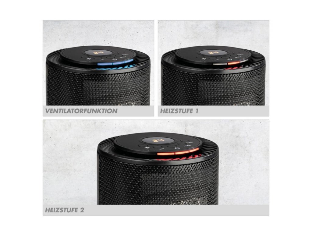 Malý, kompaktný a predsa veľmi pôsobivý vďaka dizajnu a funkcii. Teplovzdušný ohrievač GKH 1200 DT je vybavený keramickým vyhrievacím prvkom PTC. Zohrieva sa veľmi rýchlo a efektívne, zaujme jednoduchou manipuláciou a mobilitou, ako aj mnohými možnosťami použitia. Veľmi kvalitné výhrevné teleso s PTC technológiou (keramické) nespaľuje prach, a preto je vhodné na temperovanie vnútorných miestností, s využitím aj pre alergikov. Dva stupne vyhrievania s funkciou ventilátora (výber je indikovaný rôznymi kontrolkami). Oscilačná funkcia (uhol približne 70°) pre optimálne rozloženie tepla. Regulovateľný termostat pre individuálne tepelné prispôsobenie a konštantné udržiavanie teploty 16° až 37°. LED displej, funkcia časovača: 1 až 9 hodín (automatické vypnutie). Maximálna bezpečnosť vďaka ochrane proti prehriatiu a prevráteniu. Praktická rukoväť pre pohodlné a bezpečné prenášanie.