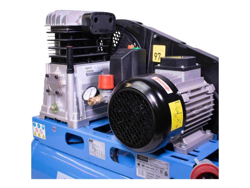 Dvojpiestový kompresor s olejovým mazaním, s remeňovým pohonom. Tlakový spínač, manometer tlaku v nádobe a manometer pracovného tlaku, 2 spojky na stlačený vzduch, dodatočný chladič, poistný ventil, spätný ventil, vypúšťací ventil na kondenzát, vzduchový filter, ochrana proti preťaženiu. Dvojitá noha s gumovým nárazníkom, plastové kolesá, prepravná rukoväť.