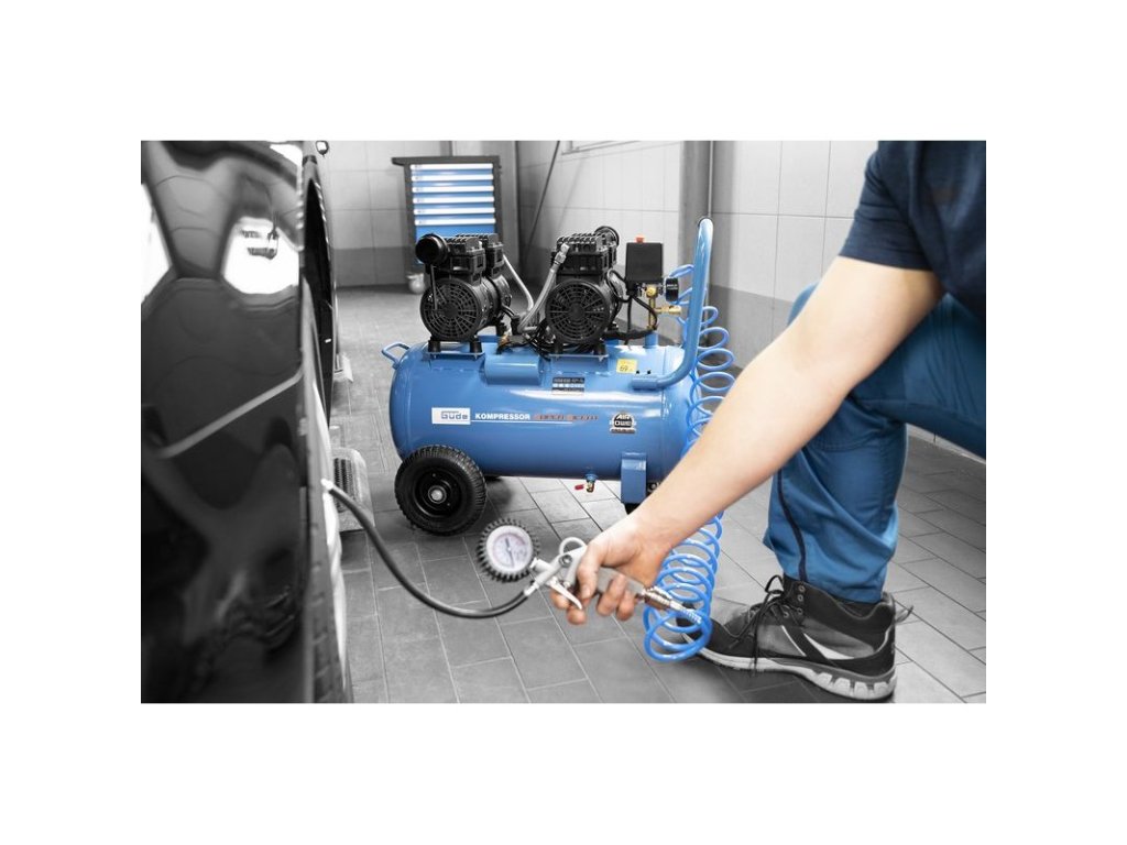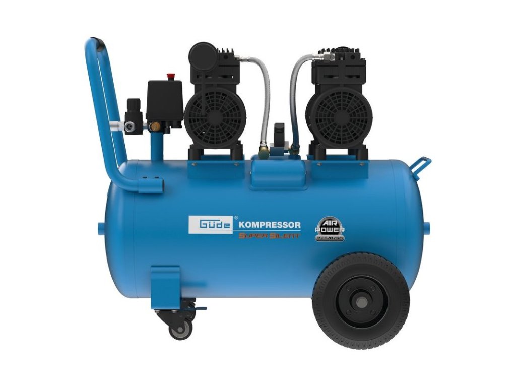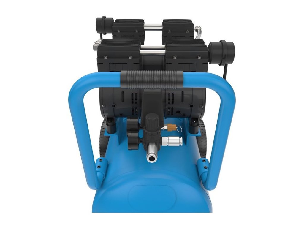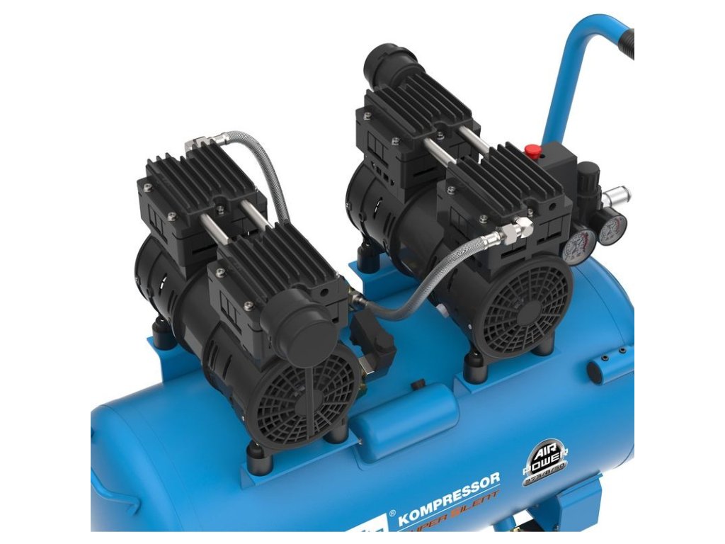 Bezolejový štvorvalcový piestový kompresor, 2 dvojpiestové agregáty so samostatným motorom, 4 vzduchové filtre, 2 prepínacie relé pre oneskorený štart, mechanický tlakový spínač, manometer na meranie tlaku v nádobe a pracovného tlaku. 50-litrová nádrž, rukoväť na prenášanie a riadiace kolieska. Tichý chod. Dve pneumatické spojky, bezpečnostný ventil a vypúšťacia skrutka na kondenzát.