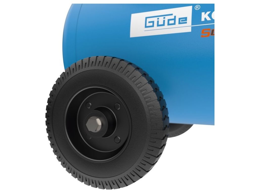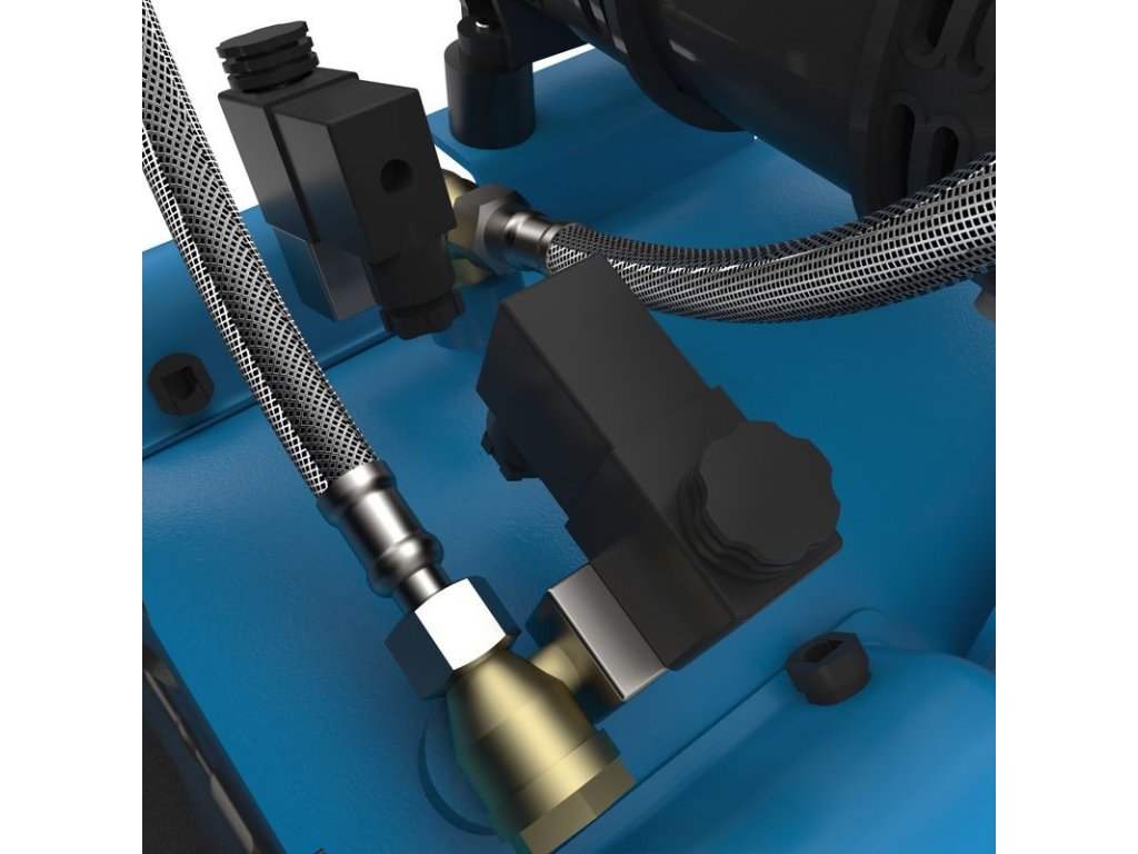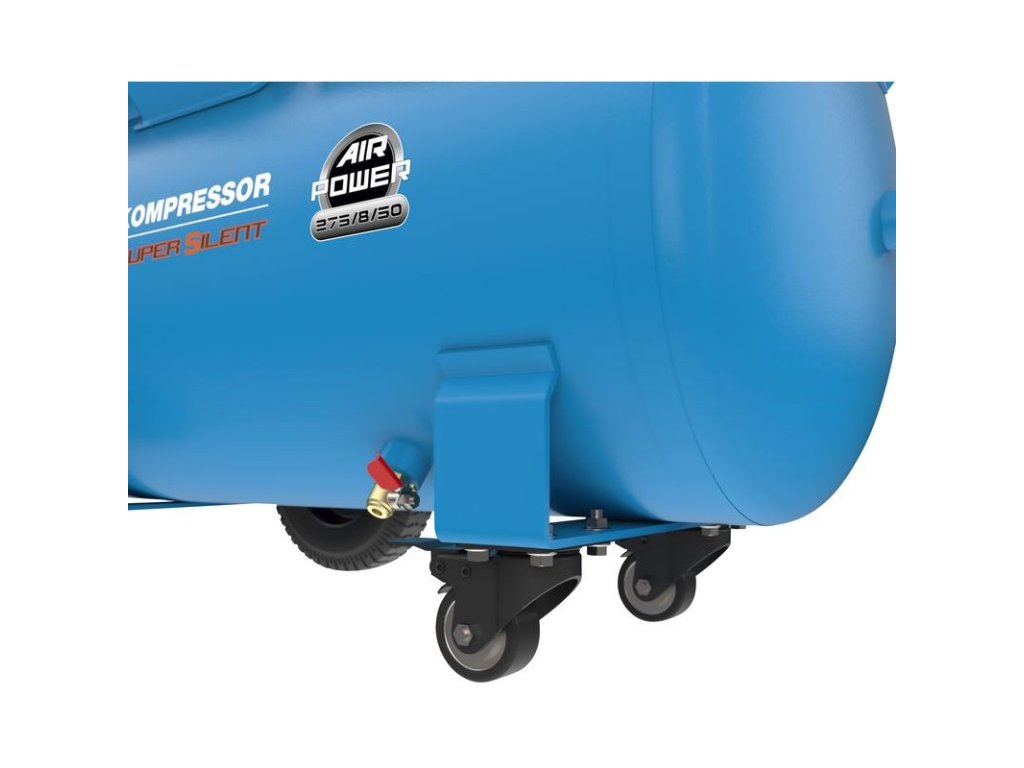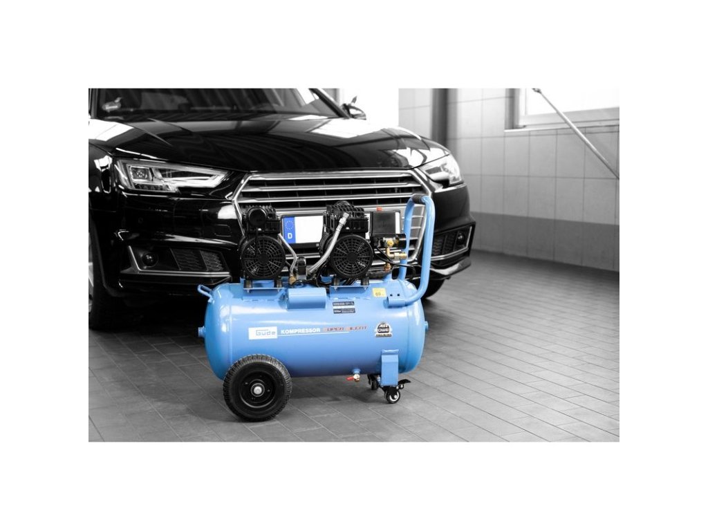 Bezolejový štvorvalcový piestový kompresor, 2 dvojpiestové agregáty so samostatným motorom, 4 vzduchové filtre, 2 prepínacie relé pre oneskorený štart, mechanický tlakový spínač, manometer na meranie tlaku v nádobe a pracovného tlaku. 50-litrová nádrž, rukoväť na prenášanie a riadiace kolieska. Tichý chod. Dve pneumatické spojky, bezpečnostný ventil a vypúšťacia skrutka na kondenzát.