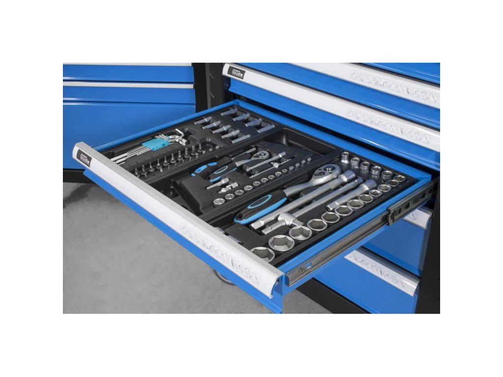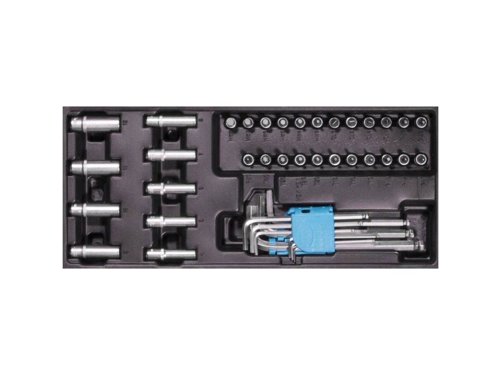 Imbusové kľúče na skrutky s vnútorným šesťhranom s guľovou hlavou na dlhom konci vo veľkostiach: 1.5, 2, 2.2, 3, 4, 5, 6, 8, 10 mm, nástrčné kľúče dlhé s upínaním 1/4" vo veľkostiach: 4, 5, 6, 7, 8, 9, 10, 11, 12 mm. Nástrčné kľúče s upínaním 1/4" vo veľkostiach T8, T10, T15, T20, T25, T30, T40 / H3, H4, H5, H6, H7, H8 / PH1, PH2, PH3 / PZ1, PZ2, PZ3 / SL3, SL4, SL5, SL6. V plastovej vložke do zásuvky.
