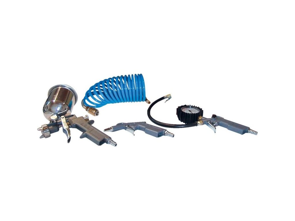 Striekacia pištoľ vhodná na spracovanie základných náterov a farieb rôznej viskozity. Nádoba a pištoľová rukoväť z hliníka. Regulácia farby a objemu vzduchu na rukoväti. Hustilka pneumatík s veľkým a dobre čitateľným tlakomerom s jednoduchou manipuláciou. Rukoväť a kryt z hliníka. Vhodná na ventily automobilových pneumatík. Vyfukovacia pištoľ s krytom z tlakovo liateho hliníka vhodná na čistenie a vyfukovanie dutín a podobne. Špirálová hadica z PU, vybavená ochranou proti zalomeniu, s rýchlospojkou.