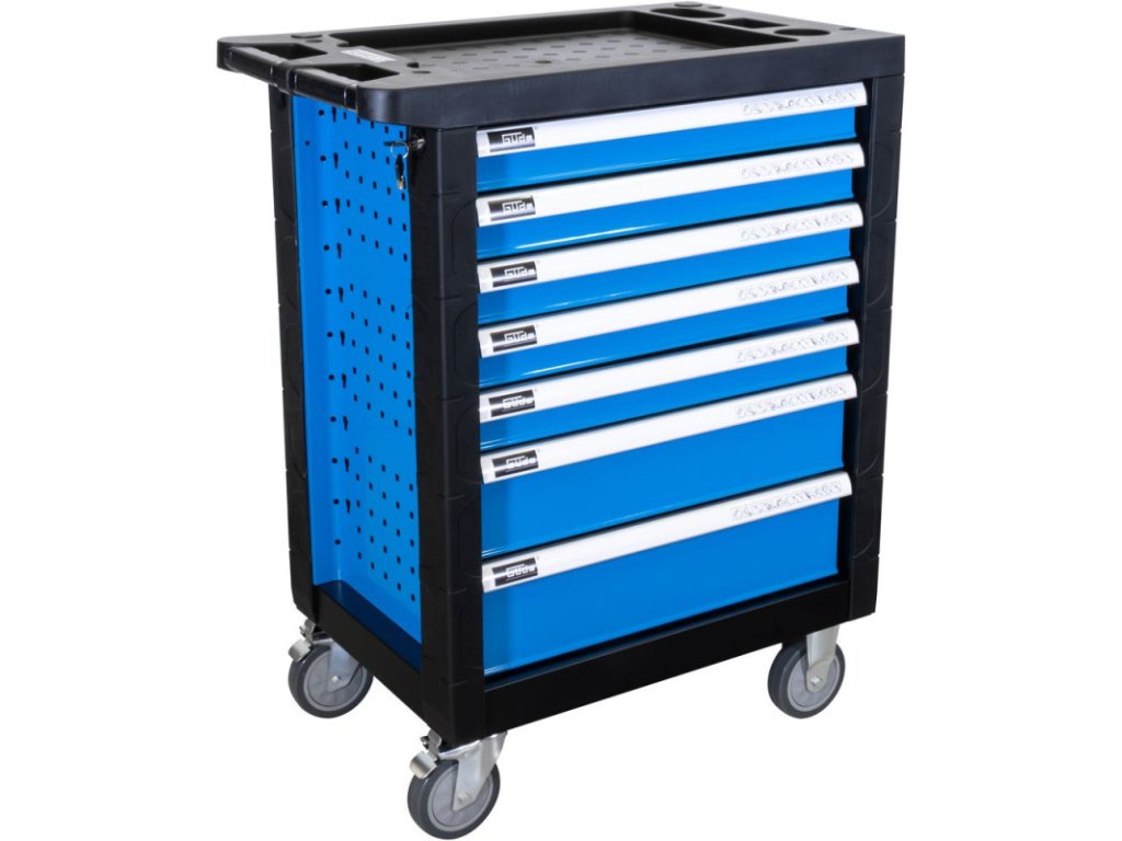 Dielenský vozík s plným výsuvom zásuviek s guľôčkovými ložiskami. Má ergonomickú tlačnú rukoväť a ochranu hrán. Veľký úložný priestor na vrchu a zásuvky na malé súčiastky a náradie uľahčujú prácu. Centrálne zamykanie s 2 kľúčmi a brzdy na dvoch otočných kolieskach. Označenie zásuviek vďaka označovacím políčkam. Perforované bočné steny na oboch stranách na zavesenie háčikov na náradie. Dvojité steny pre väčšiu stabilitu.