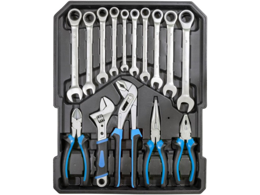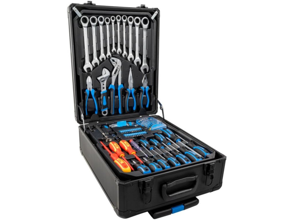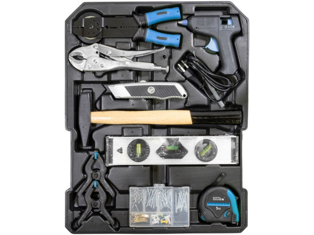 V sade sa nachádza základné náradie z chróm-vanádiovej ocele do každej domácnosti či dielne, upevňovacie svorky, kladivo 300 g, trapézový orezávací nôž, krimpovacie kliešte, univerzálne škripcové kliešte, meracie pásmo 5 m, termolepiaca pištoľ, vodováha, izolačná páska, káblové viazače, rôzne klince a skrutky.