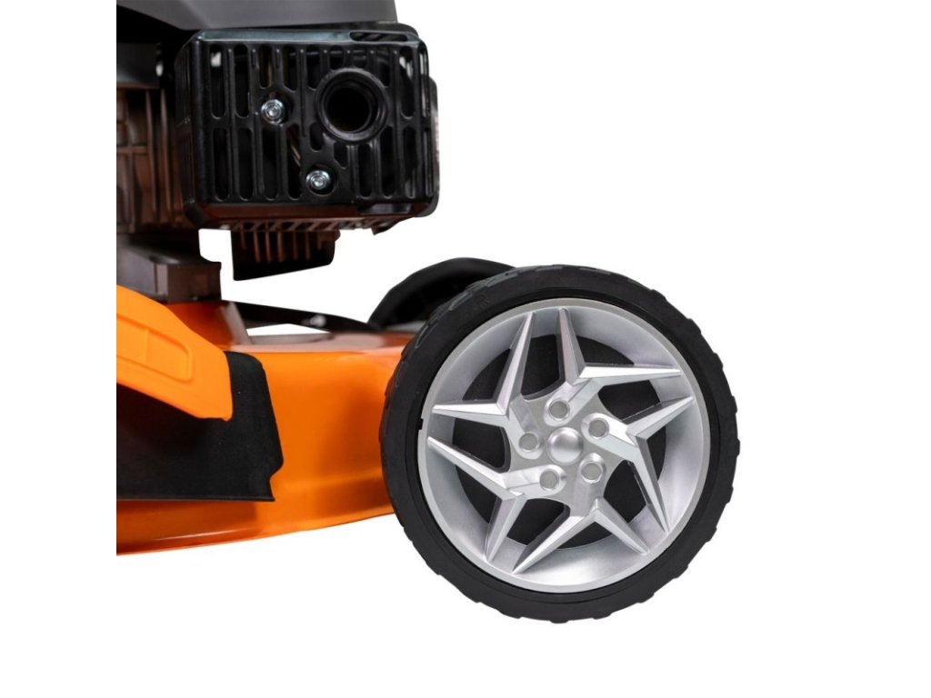 Veľký priemer kolies (19 cm vpredu / 27 cm vzadu) umožňuje kosiť trávnik aj v oblastiach so sklonom až 15 stupňov.