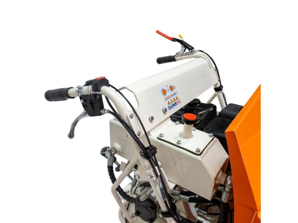 Stroj je vybavený hydraulickým sklápacím systémom, čo je dôležitá výhoda, ktorá značne zjednodušuje vykladanie ťažkých alebo objemných materiálov. Tento mechanizmus pomáha pri zdvíhaní vedra, čím znižuje potrebnú fyzickú námahu a umožňuje kontrolované, rýchle a bezpečné vyprázdňovanie, a to aj pri maximálnom zaťažení.