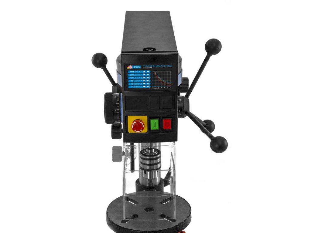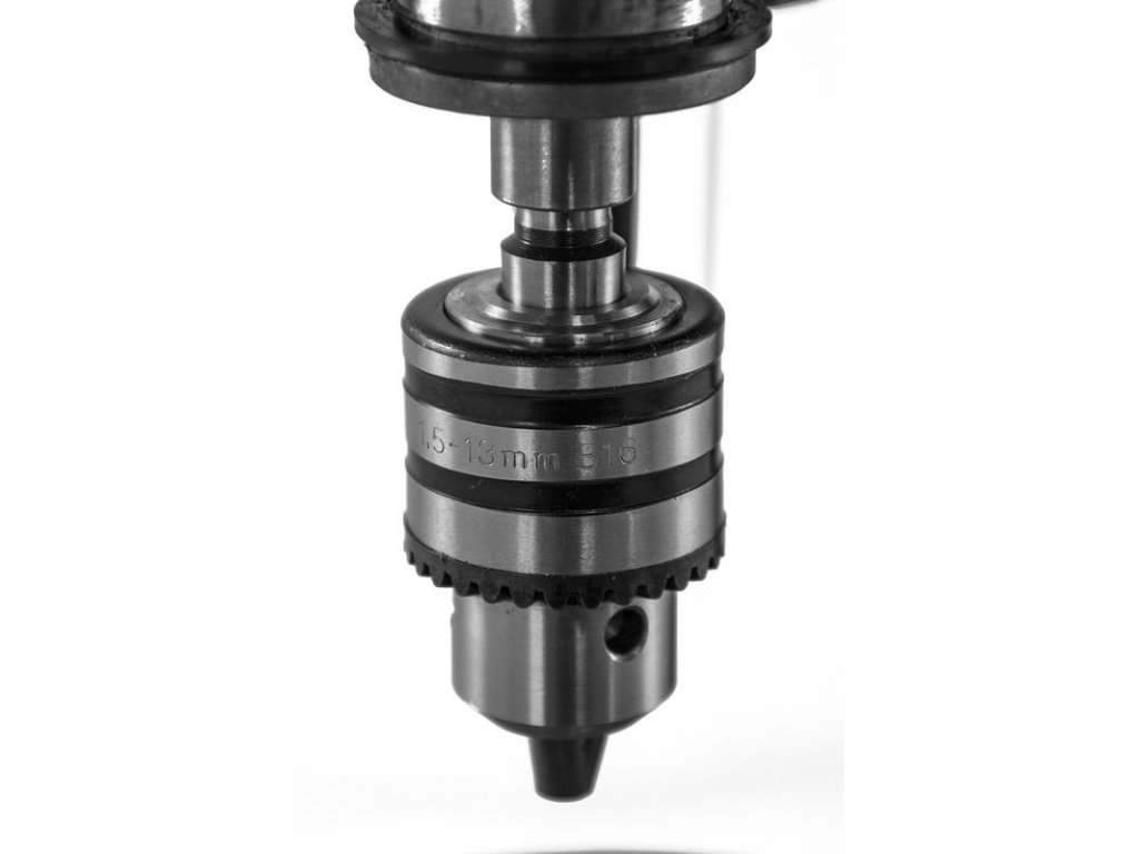 Stolová vŕtačka s pohonom klinovým remeňom, nastavenie rýchlosti pomocou stupňovitej remenice. Systém napínania klinového remeňa. Vŕtacie vreteno uložené v guľôčkových ložiskách. Vypínač so spínačom nulového napätia. Vysoká presnosť hádzania vretena (<0,02 mm). Sklápacia ochrana proti pilinám. Vŕtací stôl výškovo nastaviteľný, otočný o 360°. Nastaviteľný hĺbkový doraz vŕtania pre presné vŕtanie.