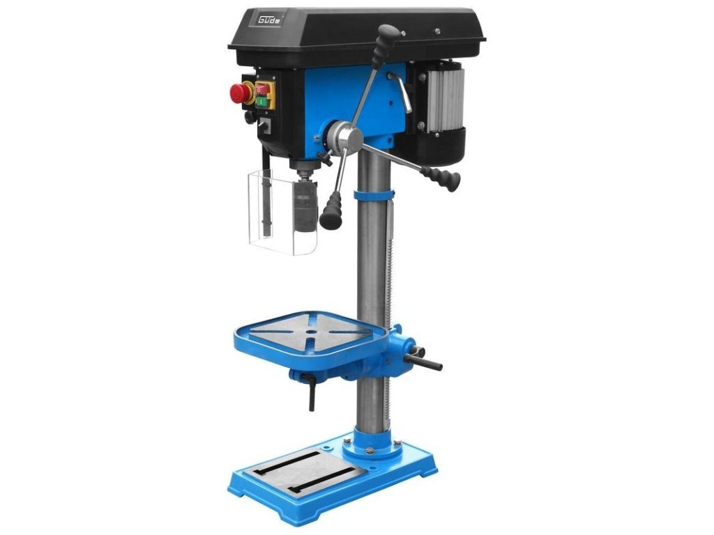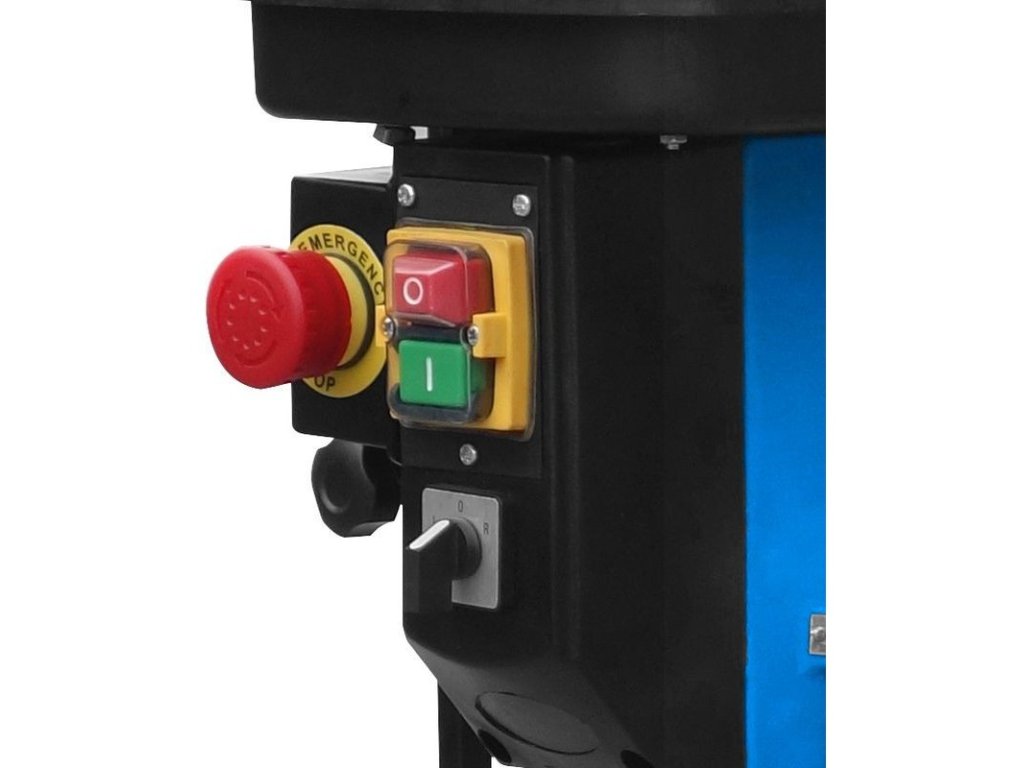 Stolová vŕtačka s pohonom klinovým remeňom, nastavenie rýchlosti pomocou stupňovitej remenice. Systém napínania klinového remeňa. Vŕtacie vreteno uložené v guľôčkových ložiskách. Pravý / ľavý chod. Vypínač so spínačom nulového napätia. Núdzový vypínač. Sklápacia ochrana proti pilinám s mikrospínačom. Vŕtací stôl výškovo nastaviteľný, sklopný o +/- 45° a otočný o 360°, s odtokovými kanálmi pre chladiacu kvapalinu. Nastaviteľný hĺbkový doraz vŕtania pre presné vŕtanie.