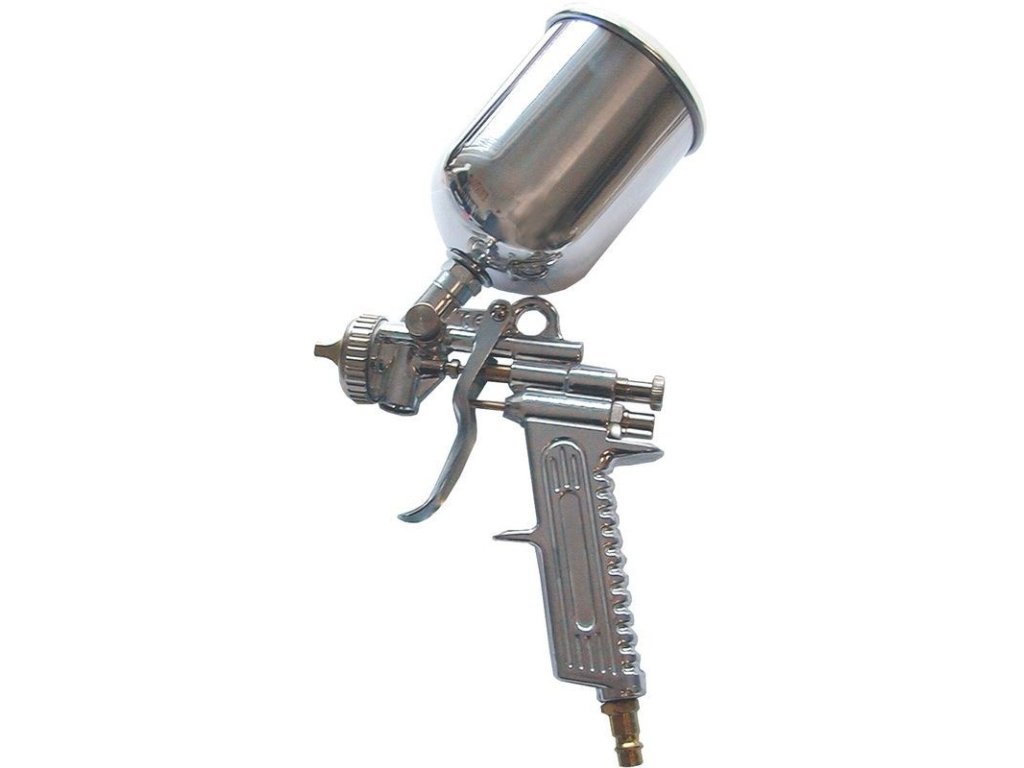 Striekacia pištoľ so spádovou nádobkou a pištoľovou rukoväťou z hliníka, regulácia farby a objem vzduchu na rukoväti, kovové veko na nádobke, prípojná vsuvka.