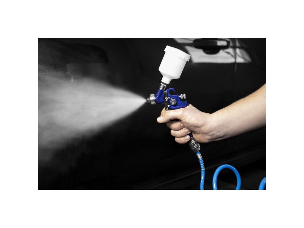 Malá nízkotlaková striekacia pištoľ z hliníka so spádovou nádobkou z plastu a technológiou HVLP, pre lakýrnicke práce menšieho rozsahu, designové lakovanie, drobné opravy a podobne. HVLP (redukcia množstva odrážanej náterovej hmoty použitím nízkeho rozprašovacieho tlaku), možnosť nastavenia kruhového/plochého nástreku, dvojitá (základná/jemná) regulácia stlačeného vzduchu, plynulé dávkovanie farby. Prípojná vsuvka.
